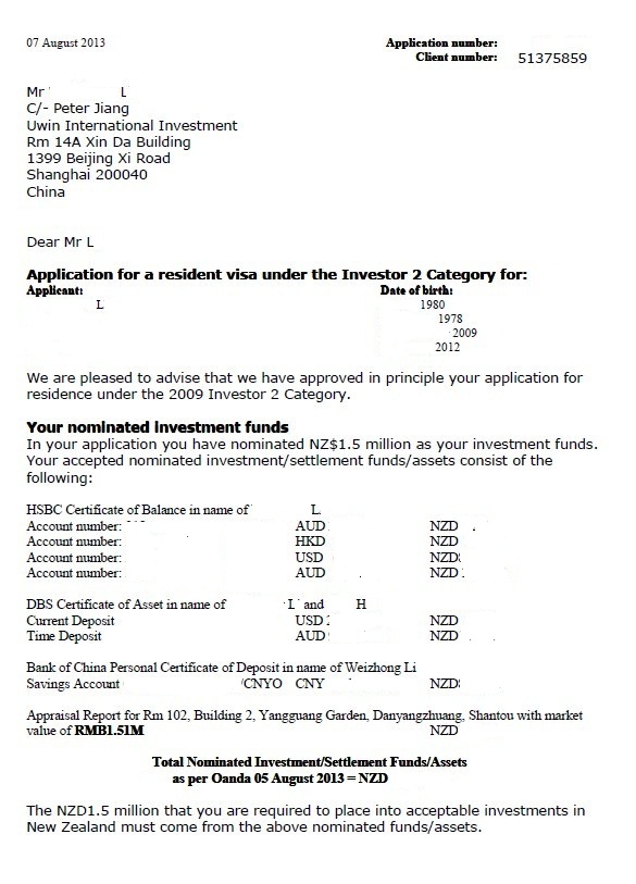 申请人做的是投资2类移民的申请。现行的投资移民新政策是2009年07月29日推出的,需要申请人满足:1)拥有相当于250万新西兰元(人民币1250万)的资产,能够投资新西兰元150万到新西兰。2)有3年或以上的经商经历 3)有英文雅思 3分的水平,获批时,申请人全家一步到位取得居留权(RV)。(带有条件),只要保持投资在新西兰境内4年,主申请人在后3年每年在境内居住146天,条件就会取消,届时,申请人获得无条件的永久居留权(PRV)。这个居留永久有效,也没有任何居住要求(全世界西方福利国家中新西兰**)。