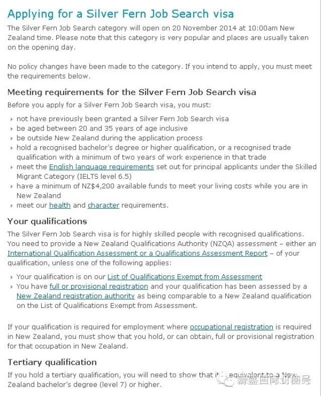 银蕨签证是新西兰移民局于2010年推出的一项求职工作签证,由Silver Fern Job Search visa和Silver Fern Practical Experience visa两部分组成。旨在为新西兰招募年轻、具有熟练技能的海外人才。如果申请成功,申请者将获发Silver Fern Job Search visa,此签将允许持有人在新西兰生活9个月时间,寻找合适的工作,如果在这段时间内签证持有人成功找到了技术性工作,那么就可以将其签证“升级”为2年期的“Silver Fern Job Experience visa”,并且不用经过labour market test,作为最终申请技术移民的“跳板”。