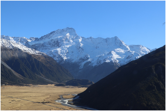 方圆700公里的库克山国家公园,被联合国教科文组织列入《世界遗产名录》。在这一片区域里有19座海拔3000米以上的高山和山谷间为数众多的冰河,最高峰库克山(3454米)终年被积雪覆盖。由于这里的气象条件不稳定,想清楚地看到库克山的雄姿需要点运气。清晨推开窗望出去,阳光明媚,空气晴朗!吃完早餐,我们神清气爽地出发了。